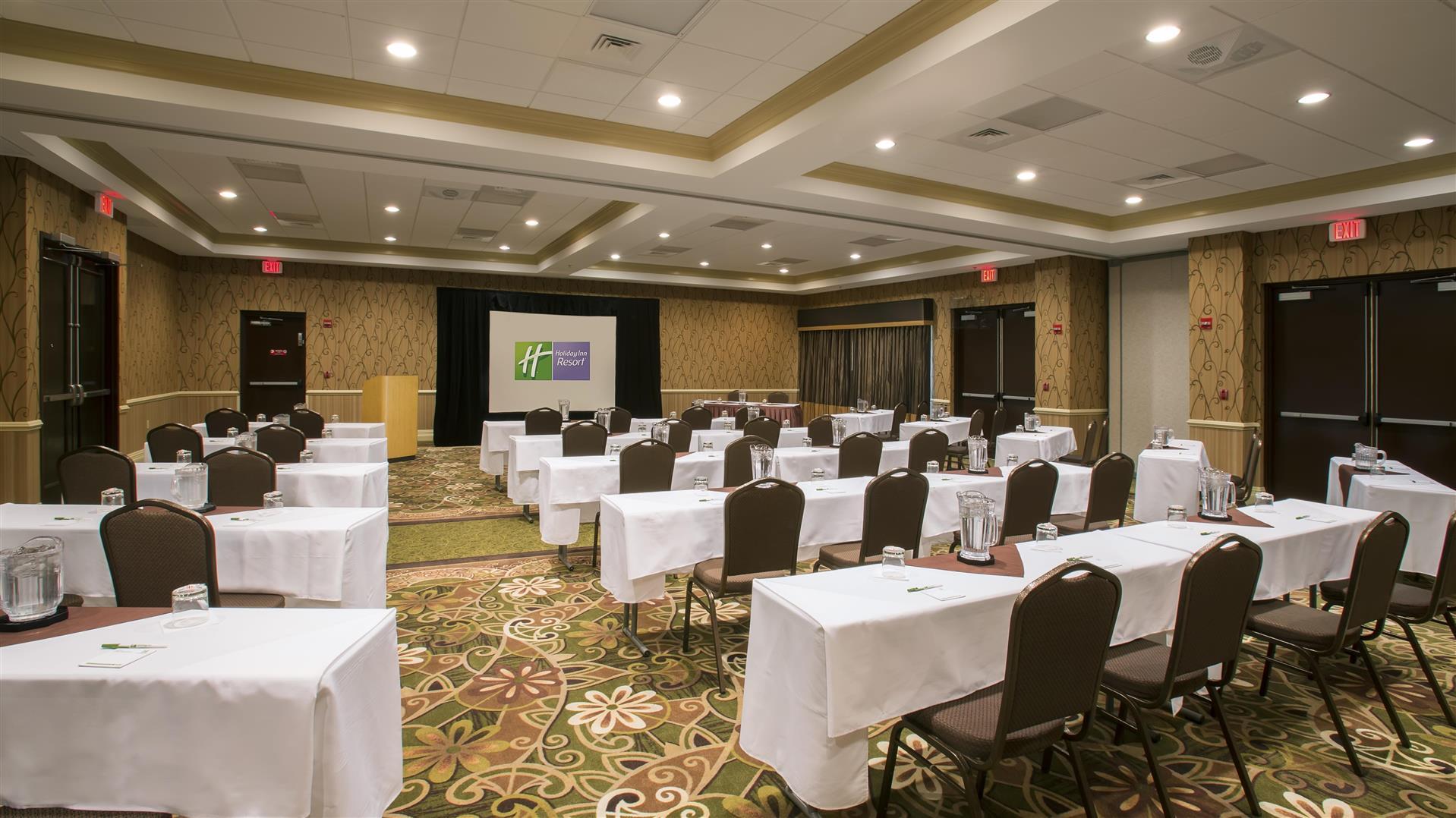 Riunioni ed eventi aziendali La preparazione delle riunioni è un gioco da ragazzi all'Holiday Inn Resort Orlando Lake Buena Vista. Hai bisogno di uno spazio con elevata capacità e flessibilità? Offriamo due ampie sale riunioni e una sala da ballo di 3.720 piedi quadrati con capacità teatrale per un massimo di 300 persone. Questa versatile sala da ballo può essere suddivisa in tre aree più piccole per soddisfare le vostre esigenze. Inoltre, la nostra spaziosa area prefunzionale è ideale per la registrazione e il check-in degli eventi. Offriamo anche servizi completi di catering e bevande, nonché una comoda ristorazione in loco presso l'Applebee's Neighborhood Grill and Bar. Con un Business Center in loco, attrezzature per riunioni a servizio completo, tra cui proiettori LCD e sistema audio, oltre a connessioni Wi-Fi e telefoniche in camera, è facile offrire presentazioni multimediali dinamiche che affascineranno il pubblico. Uno staff cordiale e reattivo è pronto a prendersi cura dei dettagli in modo che tu possa concentrarti sull'evento principale. Chiamaci oggi per maggiori informazioni o per prenotare il tuo incontro oggi!